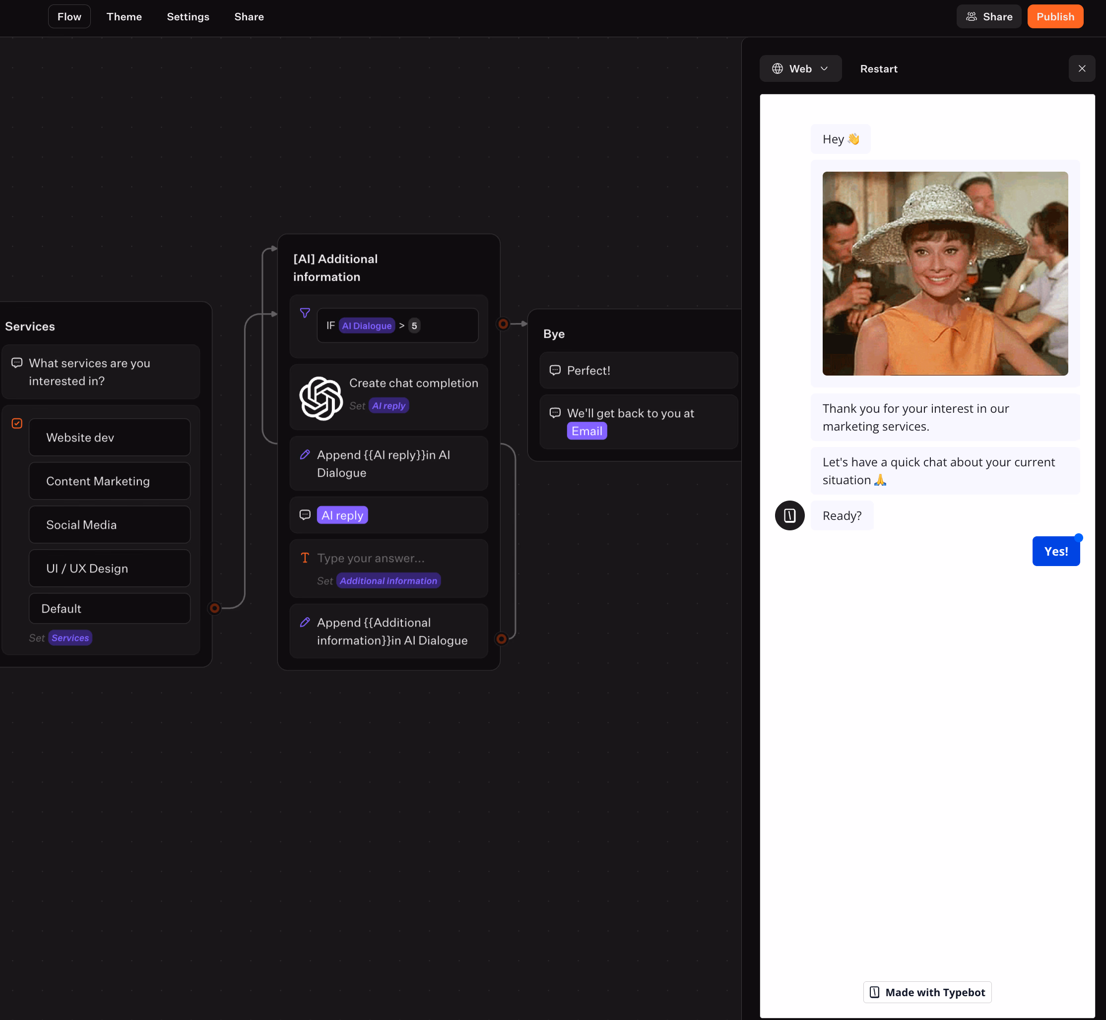 In Typebot, you build a traditional flow with and then activate AI for adaptive conversations. Here's how to do it: