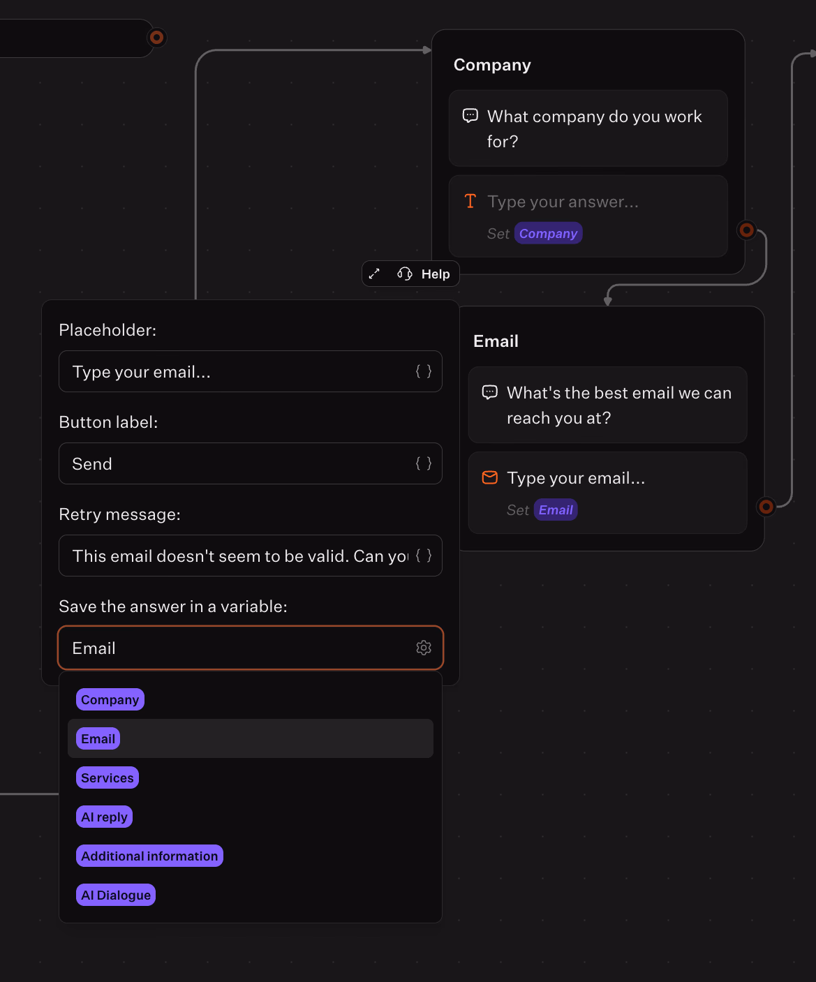 - Save answers into variables using Set variable blocks so the bot can reuse them and pass data to integrations.