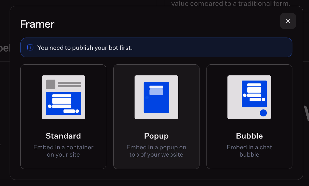 - Standard embed: the bot appears inside a container on your site, ideal for dedicated pages like contact or book a demo.
