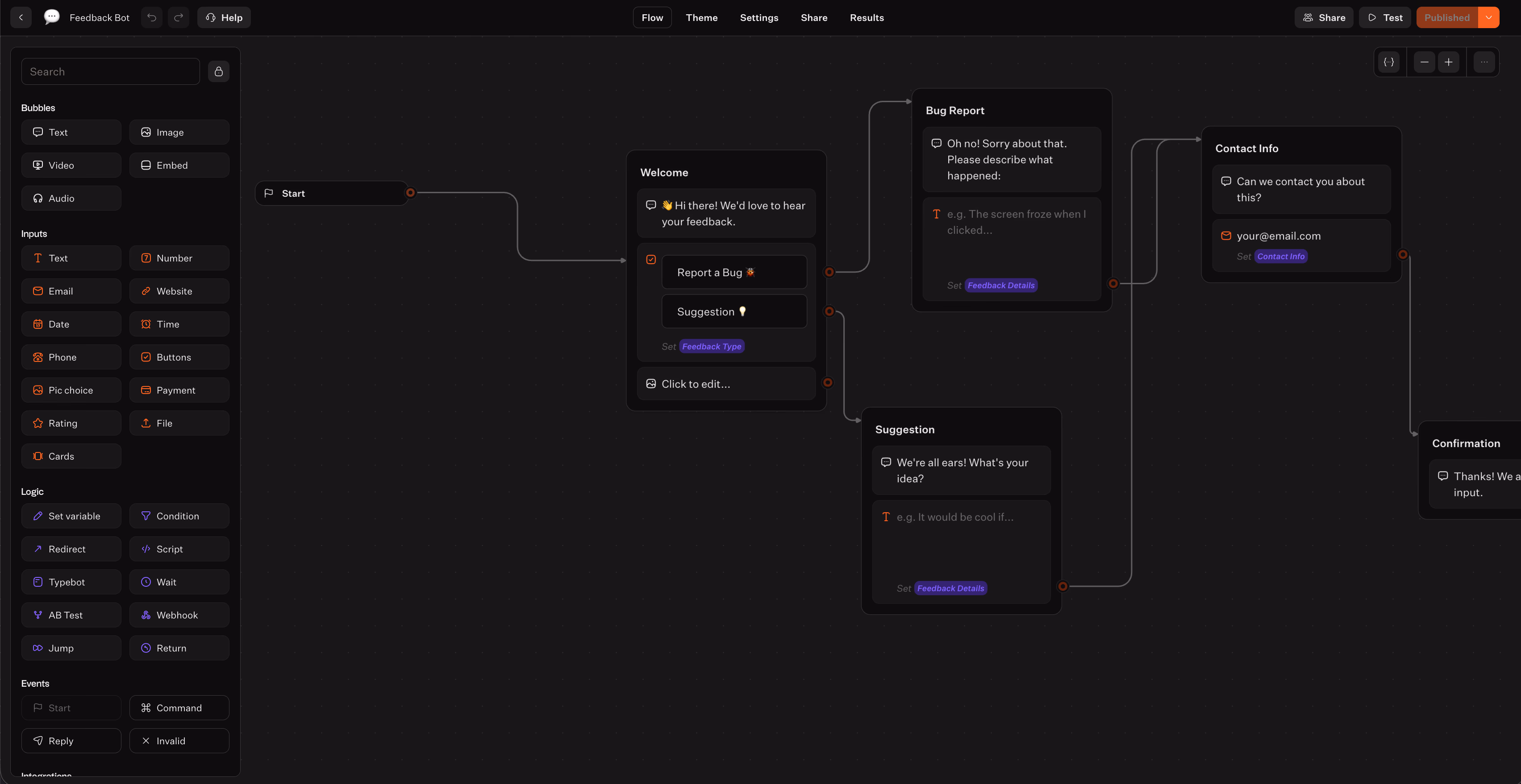 Typebot offers a visual, drag-and-drop interface that lets you create sophisticated conversational apps. You don’t need to write any code. Here's how to execute your customer service vision, whether you're solving their problems or enhancing their experience.
