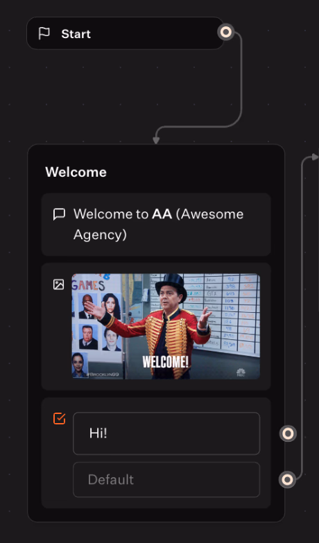 Add a short Text input (“Hi!” starter) if you want users to click/type to begin, or delete it to auto-continue.