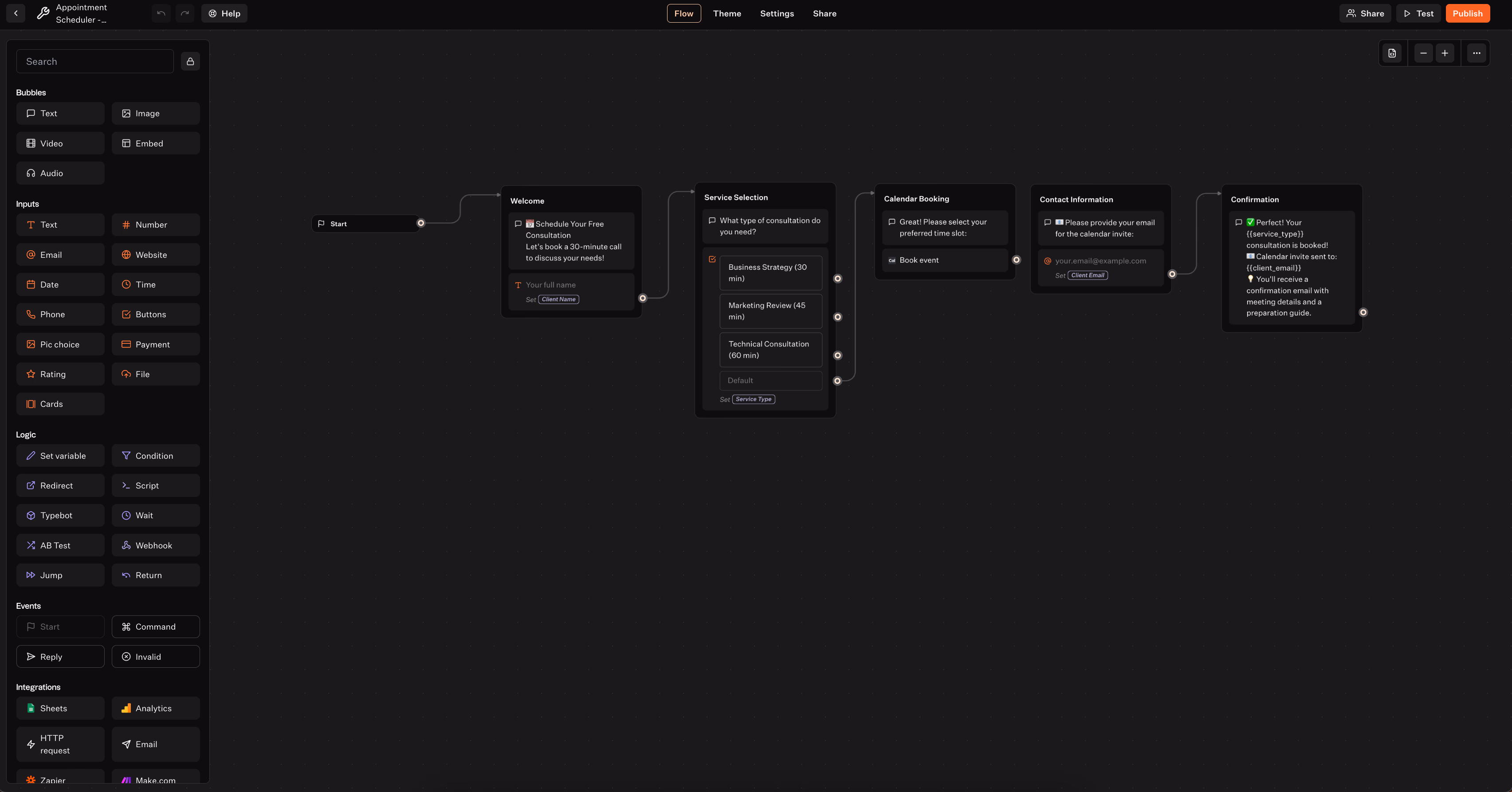 Older chatbot builders rely on rigid button-based interactions. Typebot is built to support dynamic, natural conversations with specialized input fields—calendars, file uploads, and complex forms—all within the chat.