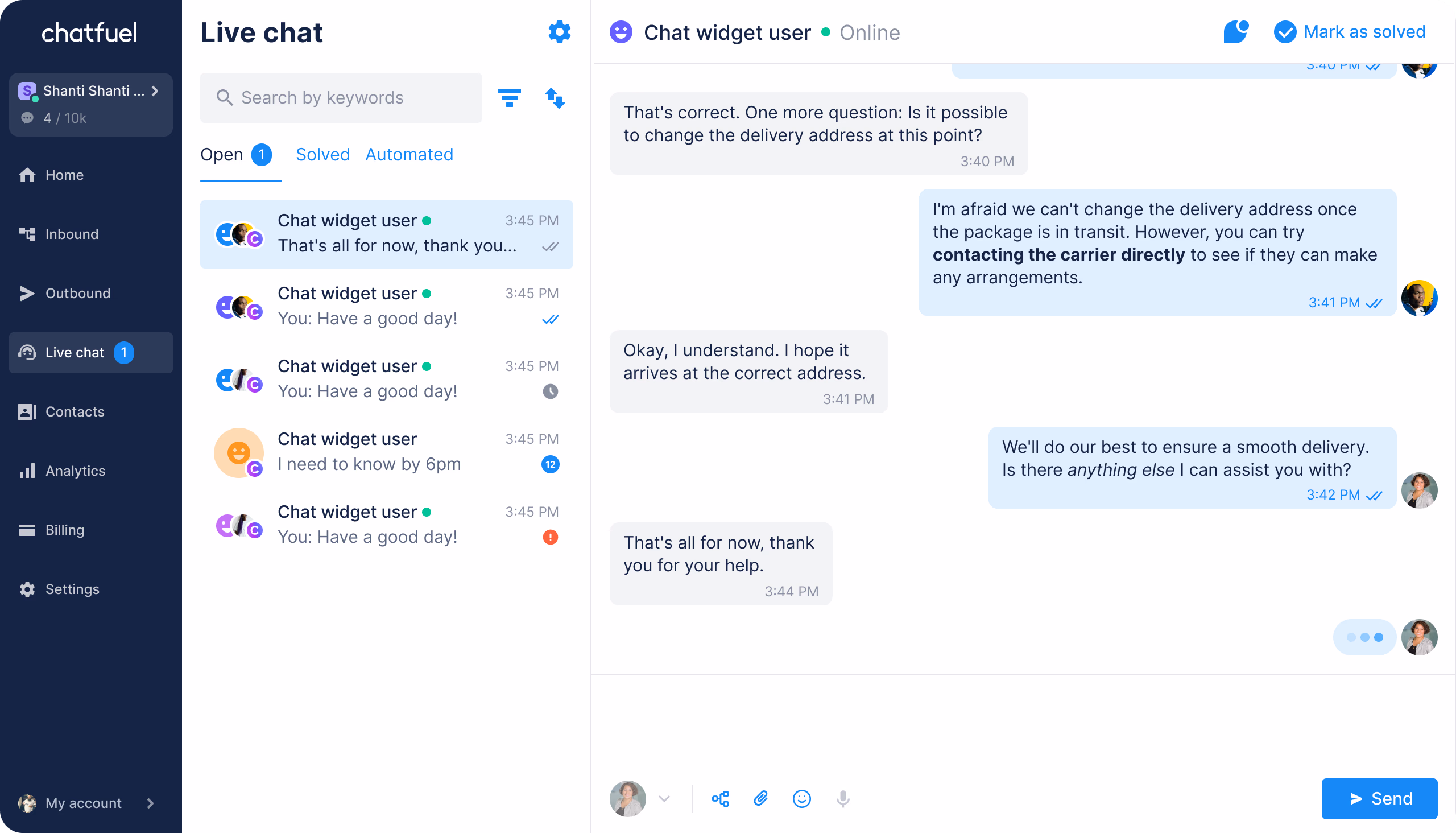 Chatfuel offers a built-in live chat feature that covers the essentials: