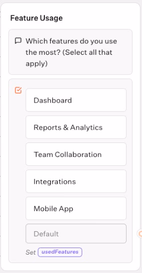 Choice Inputblock (with multiple choice enabled) to let users select which features they use most. Options could include "Dashboard", "Reports & Analytics", etc. The selected features are saved in theusedFeaturesvariable.