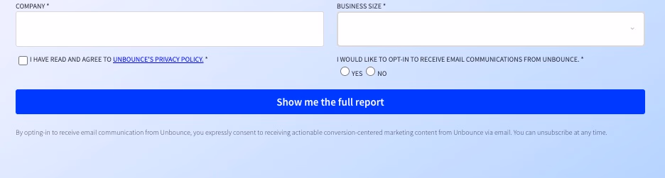 Your CTA can make or break your form's success. Consider how Unbounce's "Show me the full report" is specific and value-focused, unlike generic "Submit" buttons.