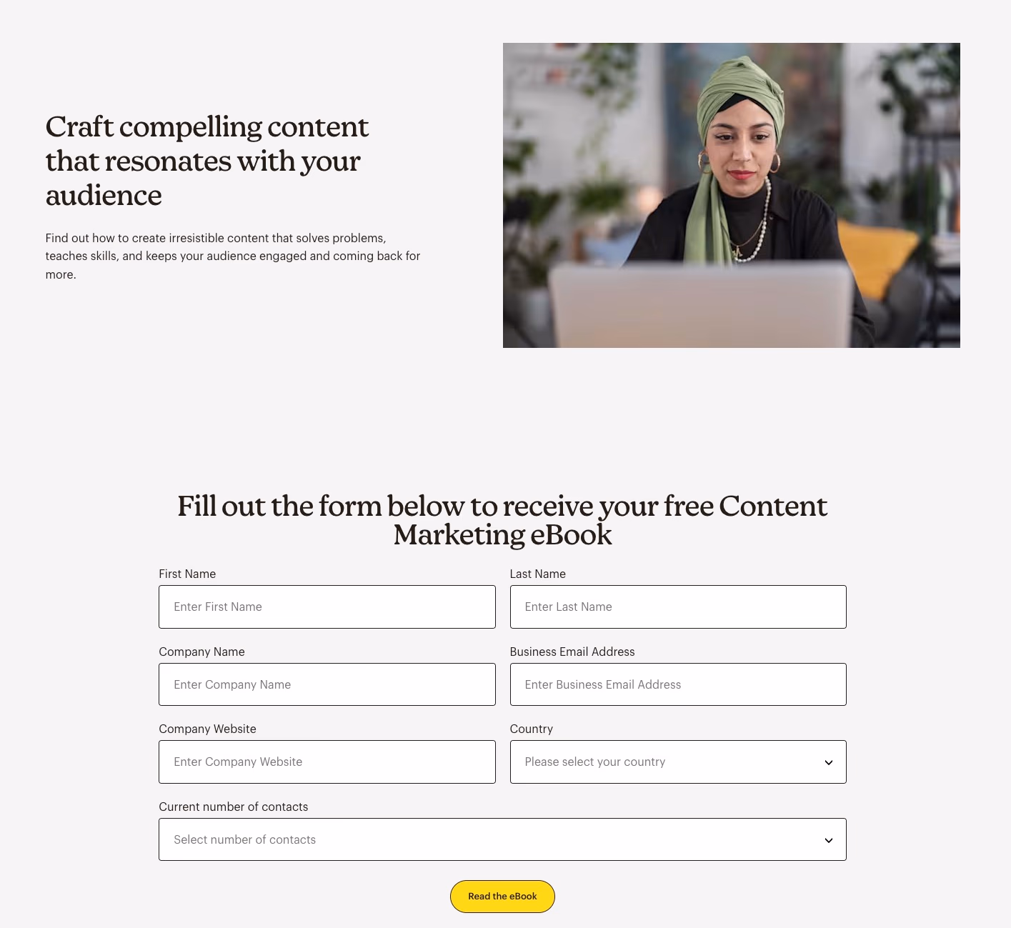 Mailchimp's content marketing ebook form shows effective lead capture through strategic placement and a clear value proposition. By embedding their form within blog posts, they catch readers already engaged with related content.