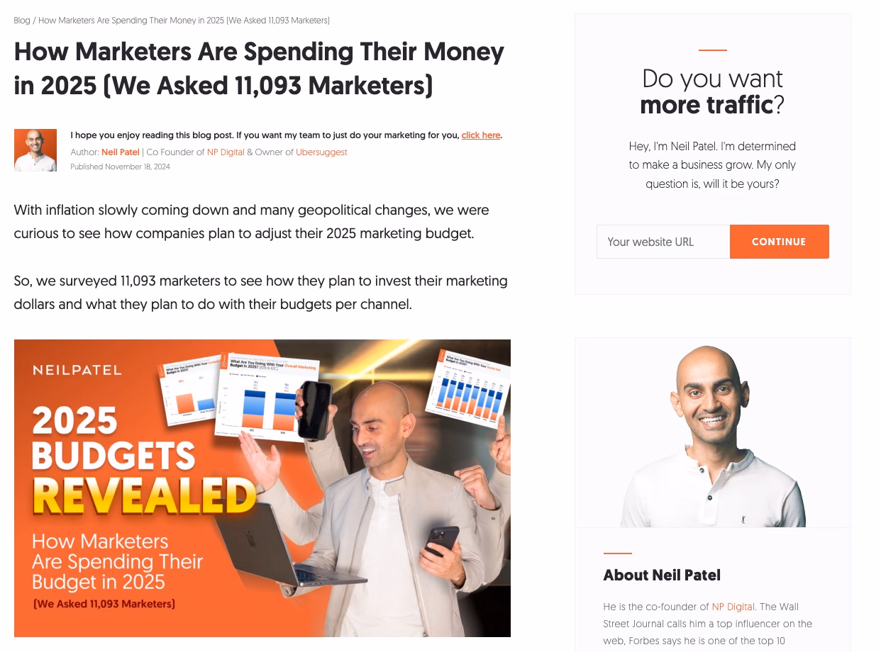 Neil Patel's sidebar form works because it directly addresses the reader's main concern: "Do you want more traffic?" Generic newsletter signup forms often fail to communicate specific benefits. Every form should answer the question: "What's in it for me?"