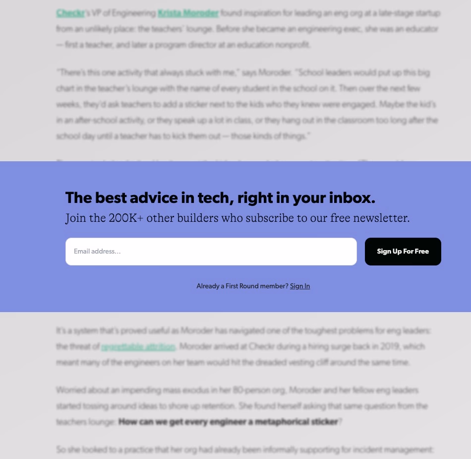 TheReview from FirstRound uses a minimalist popup newsletter form on its blog posts. They request only an email address, reducing friction. This strategy works well because: