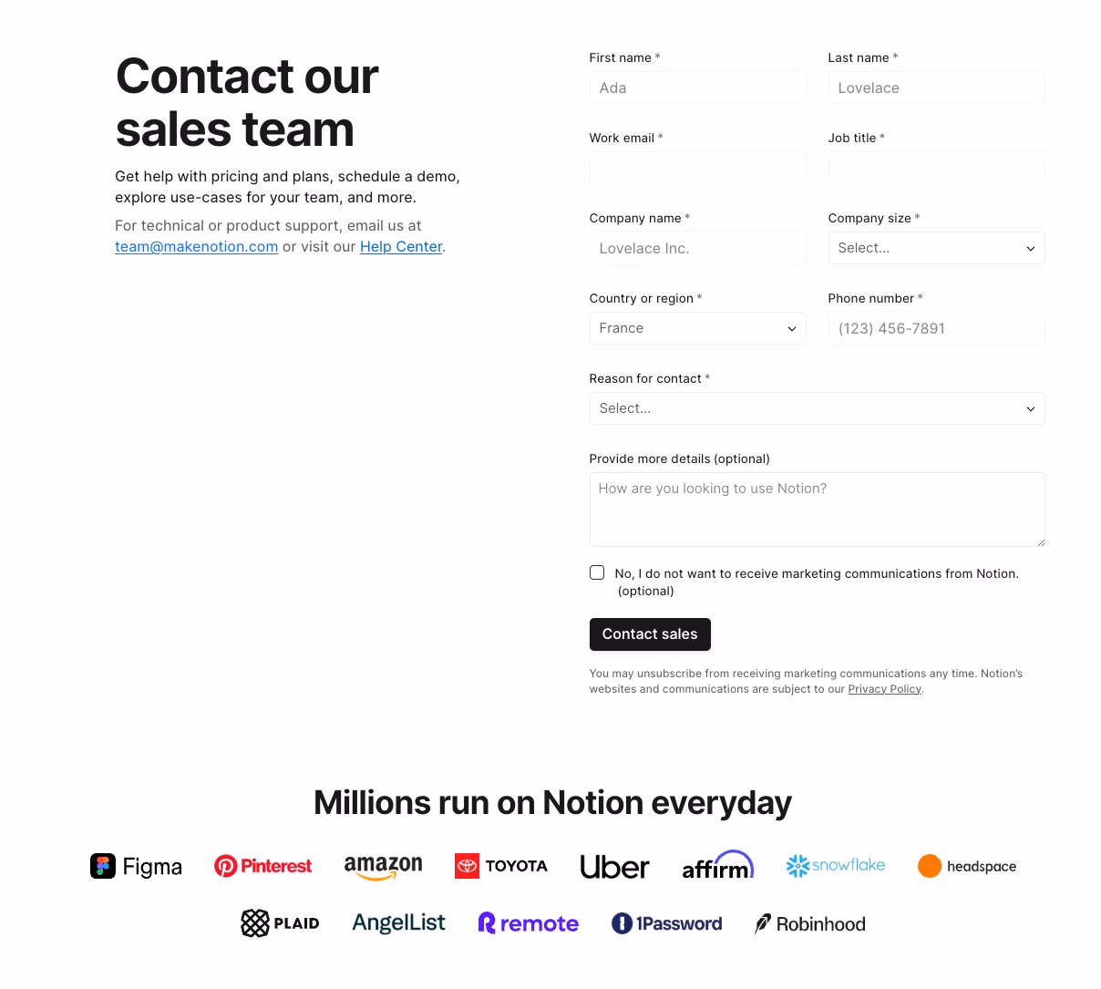 Notion takes a slightly more detailed approach with their demo request form. Beyond standard contact information, they include company size and marketing preferences, which helps segment leads and comply with privacy regulations.