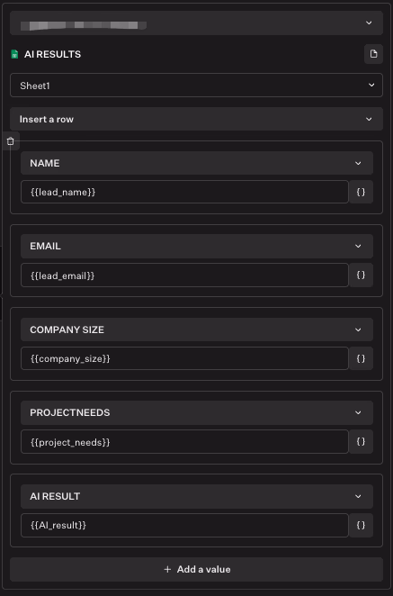 - Select your account and Sheet. Pick Insert a row. Add values for each column.