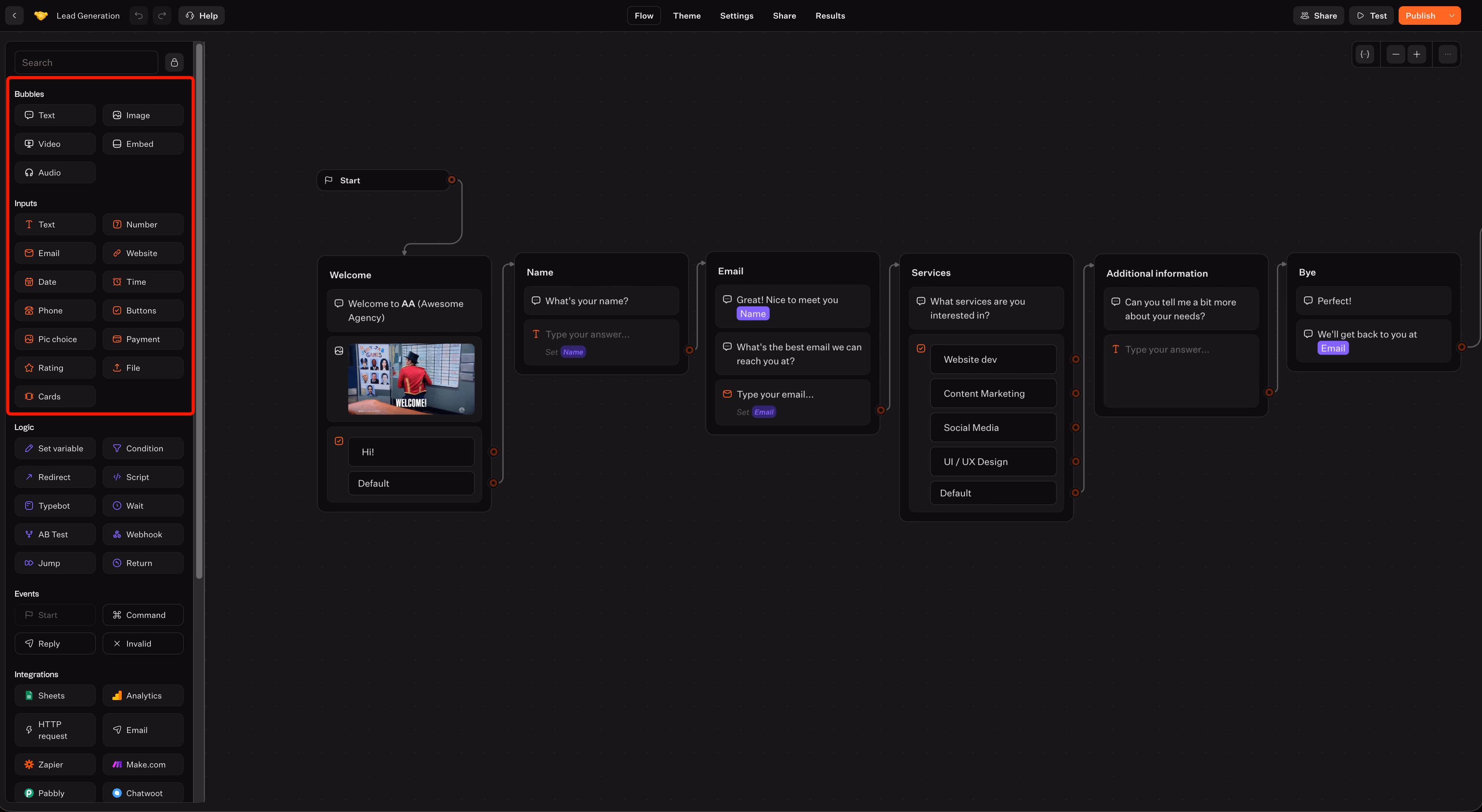 - Inputs to collect data (including Text, Email, Phone, Buttons, Cards, Website, Number, Rating, File)