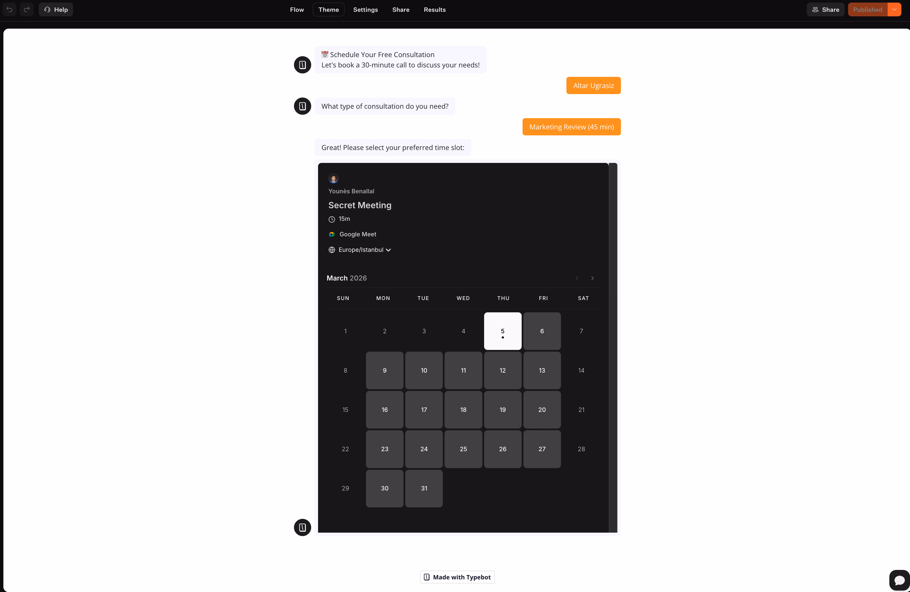 - Booking a call now when intent is high and quick response is possible. In Typebot, this usually involves directing visitors to a calendar step with the Cal.com integration after a few key questions.