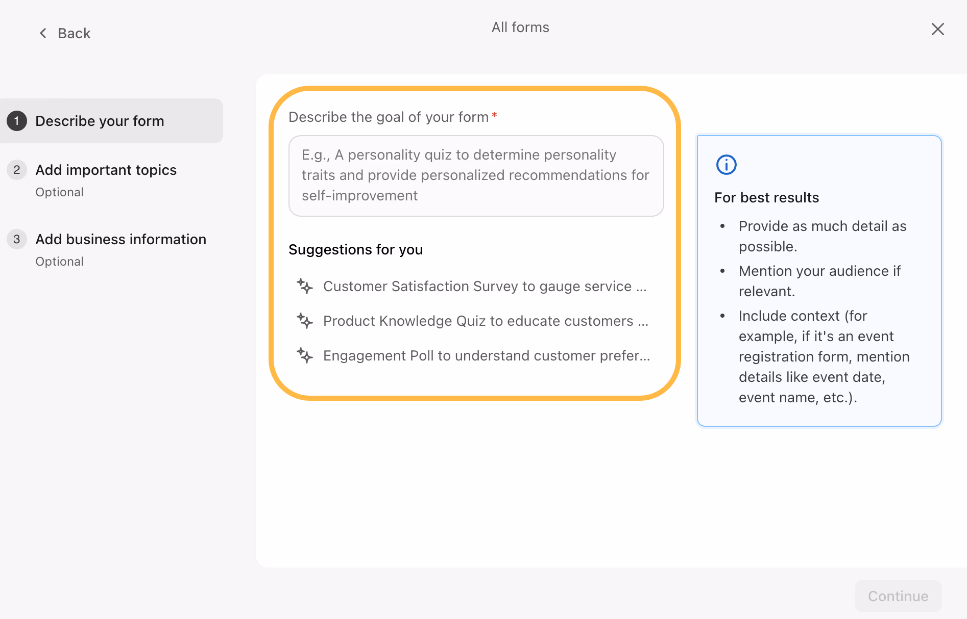 Include context about your audience. Mention your industry, target demographic, and form purpose. For example: "Create a feedback form for a family restaurant targeting parents with young children."