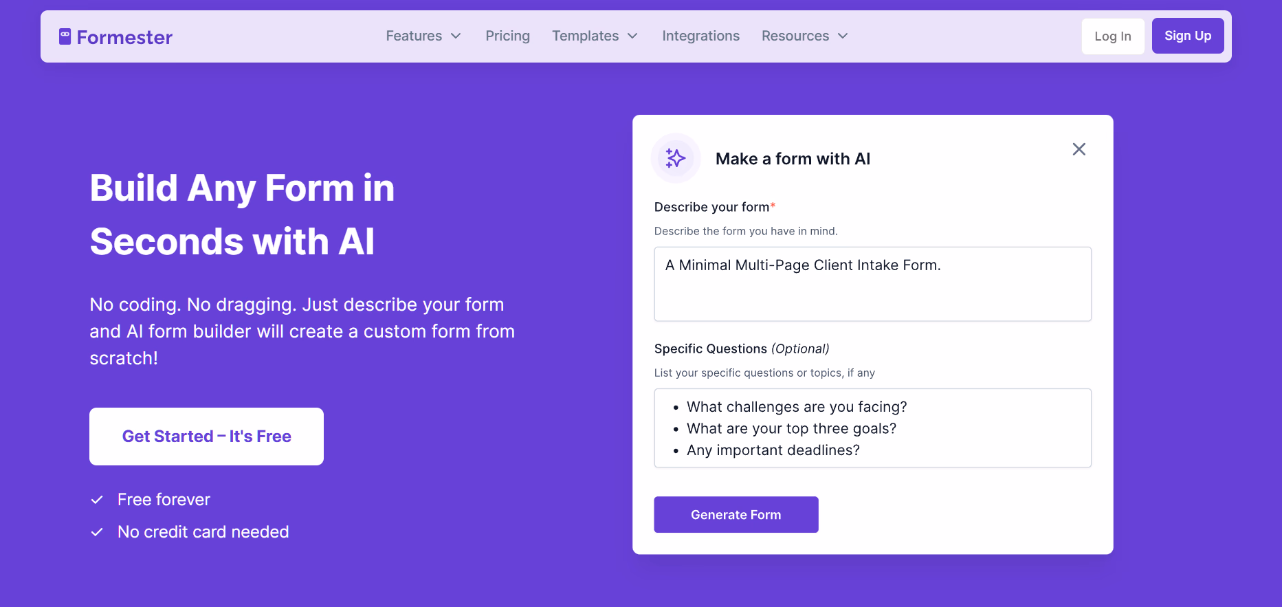| Formester | Simplicity | Small Business | Free | AI generation, payment integration |