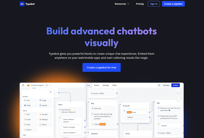 Typebot stands out as a powerful chatbot builder that makes it easy to create advanced chat experiences with 45+ building blocks. What makes Typebot special is its focus on conversational forms that feel more like natural conversations than traditional questionnaires.