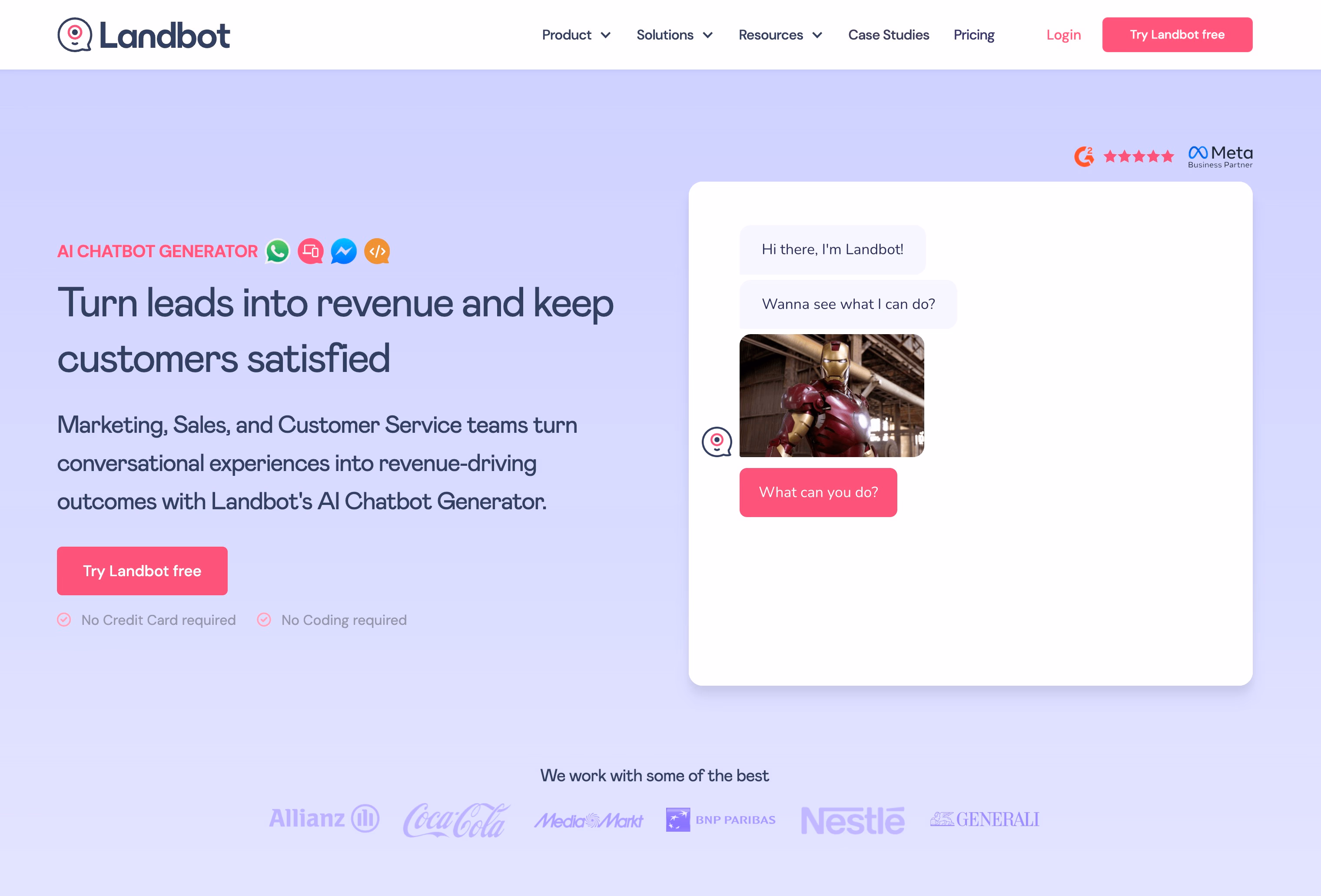 Landbot is a no-code chatbot platform. It allows businesses to create conversational experiences for websites, WhatsApp, and Facebook Messenger without needing to code.