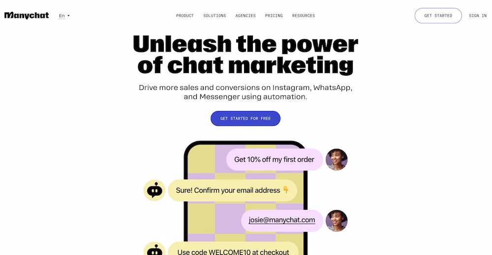 ManyChat is a chat marketing platform designed for messaging apps. It offers features to automate and enhance customer interactions. It supports Instagram Direct Messages, Facebook Messenger, WhatsApp, and Telegram and is designed mainly for e-commerce, creators, and restaurants.