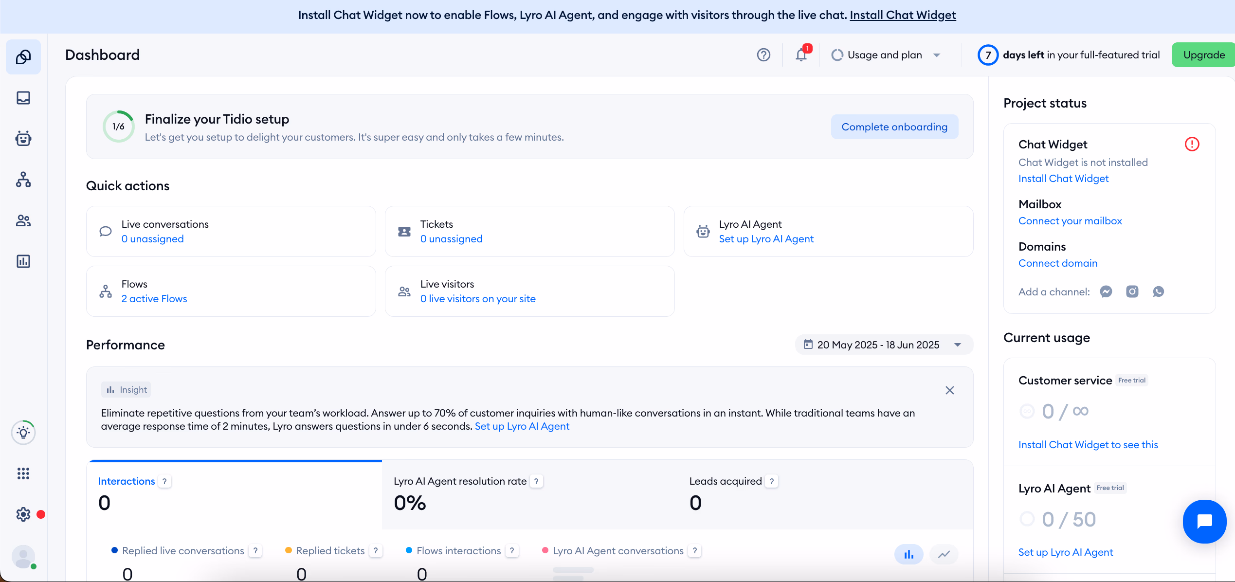 It also shines in cart recovery workflows. Bots can trigger discount codes or answer objections the moment a user hesitates. Tidio’s native integration with Shopify and Lyro AI means you can launch with automation and scale to human support as you grow.
