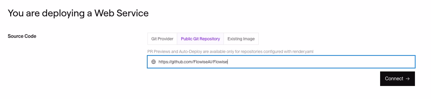 - Paste the public Flowise repository URL (https://github.com/FlowiseAI/Flowise)