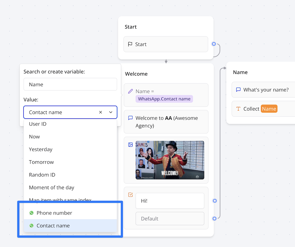 WhatsApp provide contact information of the user. You can assign them to variables to personalize your chatbot's greetings and responses. This simple touch can make the experience feel more human and tailored to the individual.
