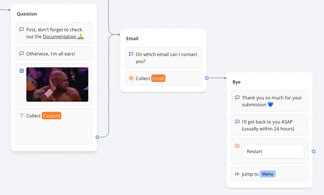 You can add text bubbles, images, videos, buttons, input fields, and various other elements to craft a seamless and interactive experience for your users.