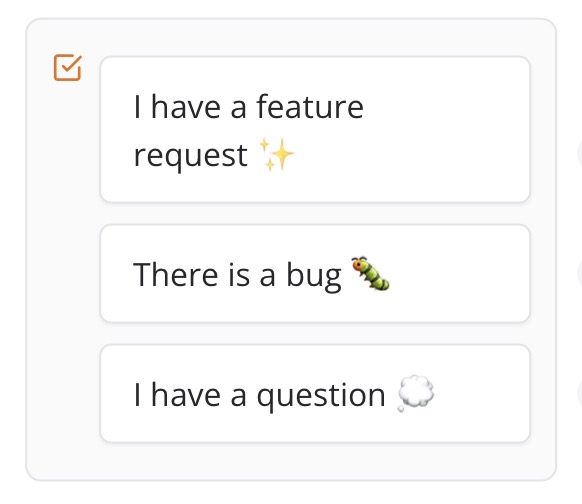 Present the user with a set of buttons, each representing a different feedback category. This streamlines the process and allows you to tailor the subsequent questions based on the user's selection.