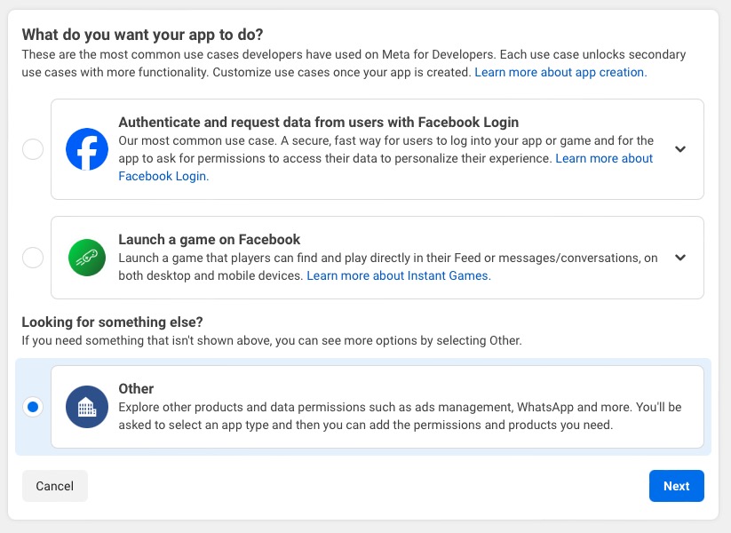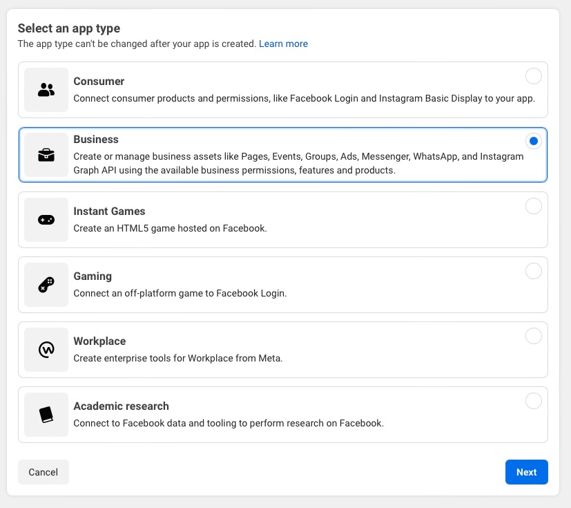 - Once you've set up your account, head over to https://developers.facebook.com/apps and create a new Meta app.