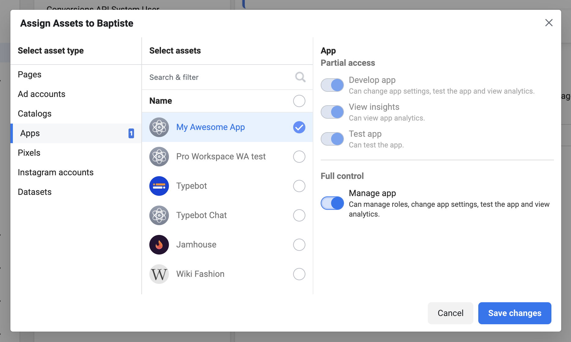- Click on Add assets. Under Apps, look for your previously created app, select it and check Manage app