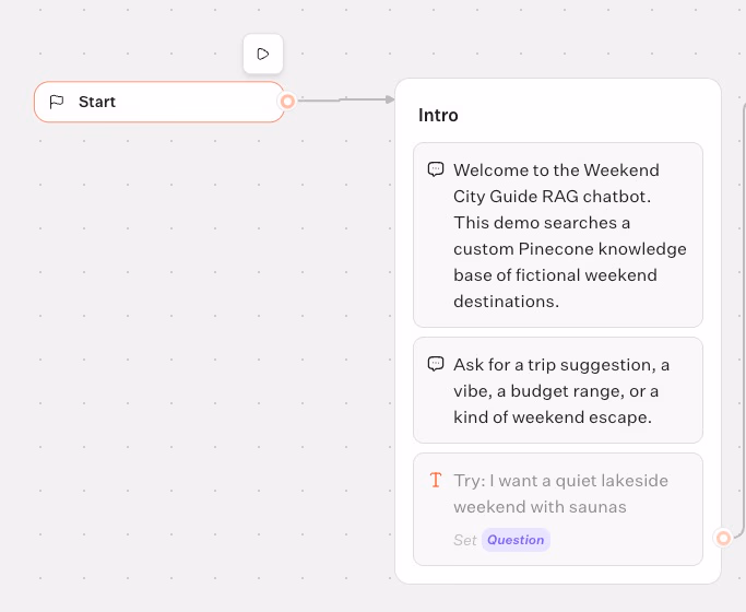 - “This demo searches a custom Pinecone knowledge base of fictional weekend destinations.”