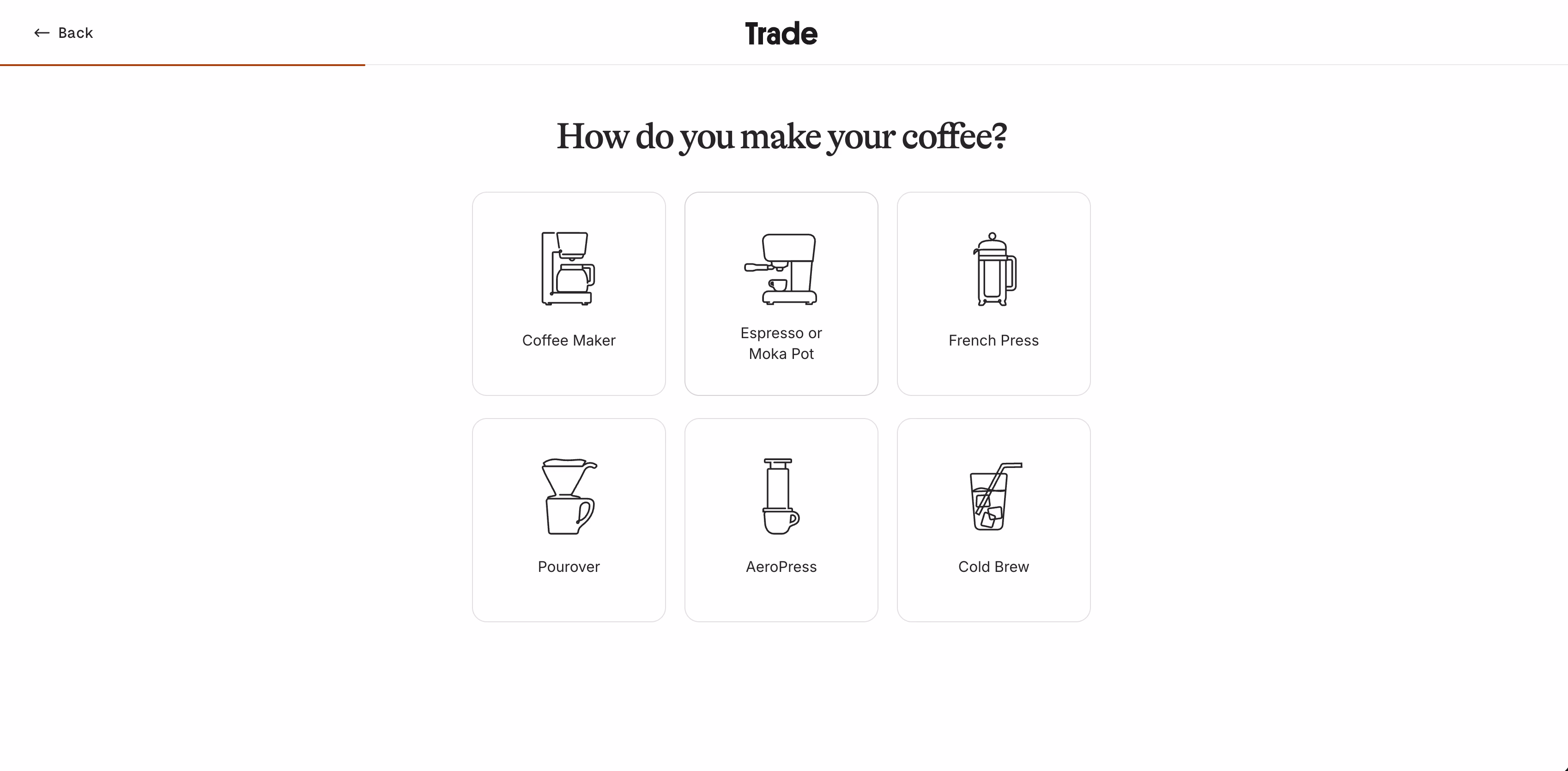 Trade Coffee shows how to digitize the sensory experience of a local cafe. Their service matches customers with local roasters. The quiz acts as a digital sommelier that cuts through the ambiguity of subjective flavor profiles.
