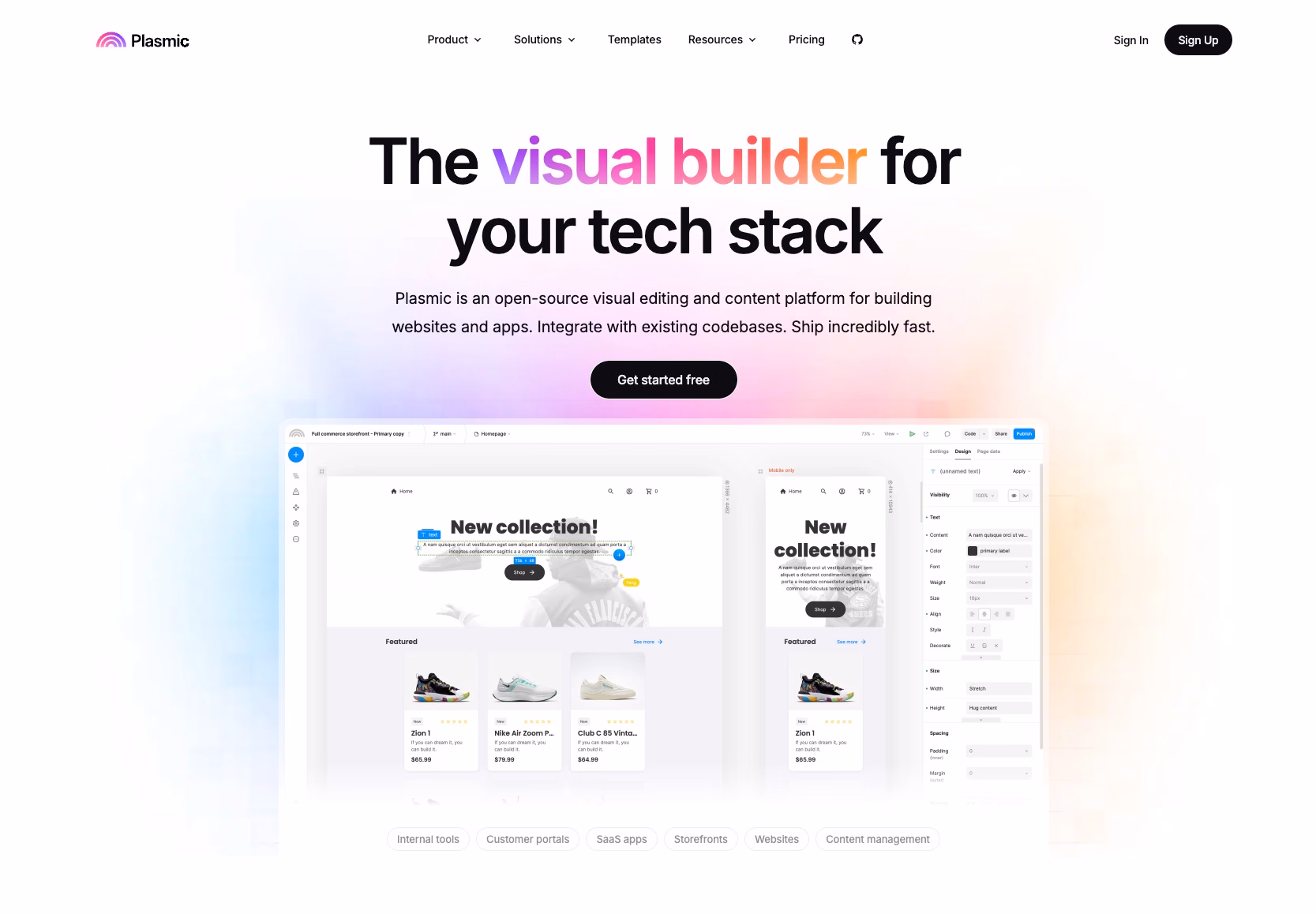 Plasmic excels in the React website builder market. It offers a unique combination of visual development tools and enterprise-grade content management. The platform empowers teams to create sophisticated React applications without sacrificing development flexibility or content governance.
